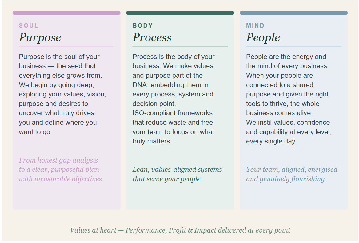 So that is where I choose to be. Working with businesses, charities, social enterprises and purpose-led organisations of every kind — helping them combine their values and vision with the structures, systems and strategies that turn passion into performance, and purpose into lasting, positive impact.