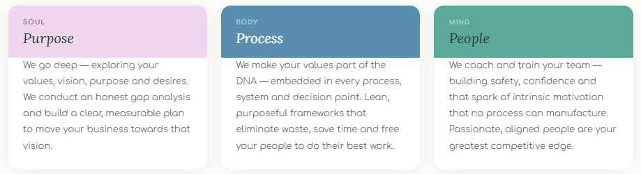 Most business improvement starts with the problems and the systems. We start with something deeper — your values, vision and purpose. We know that when those are clear, understood and embedded into everything you do, the performance and impact follow naturally.